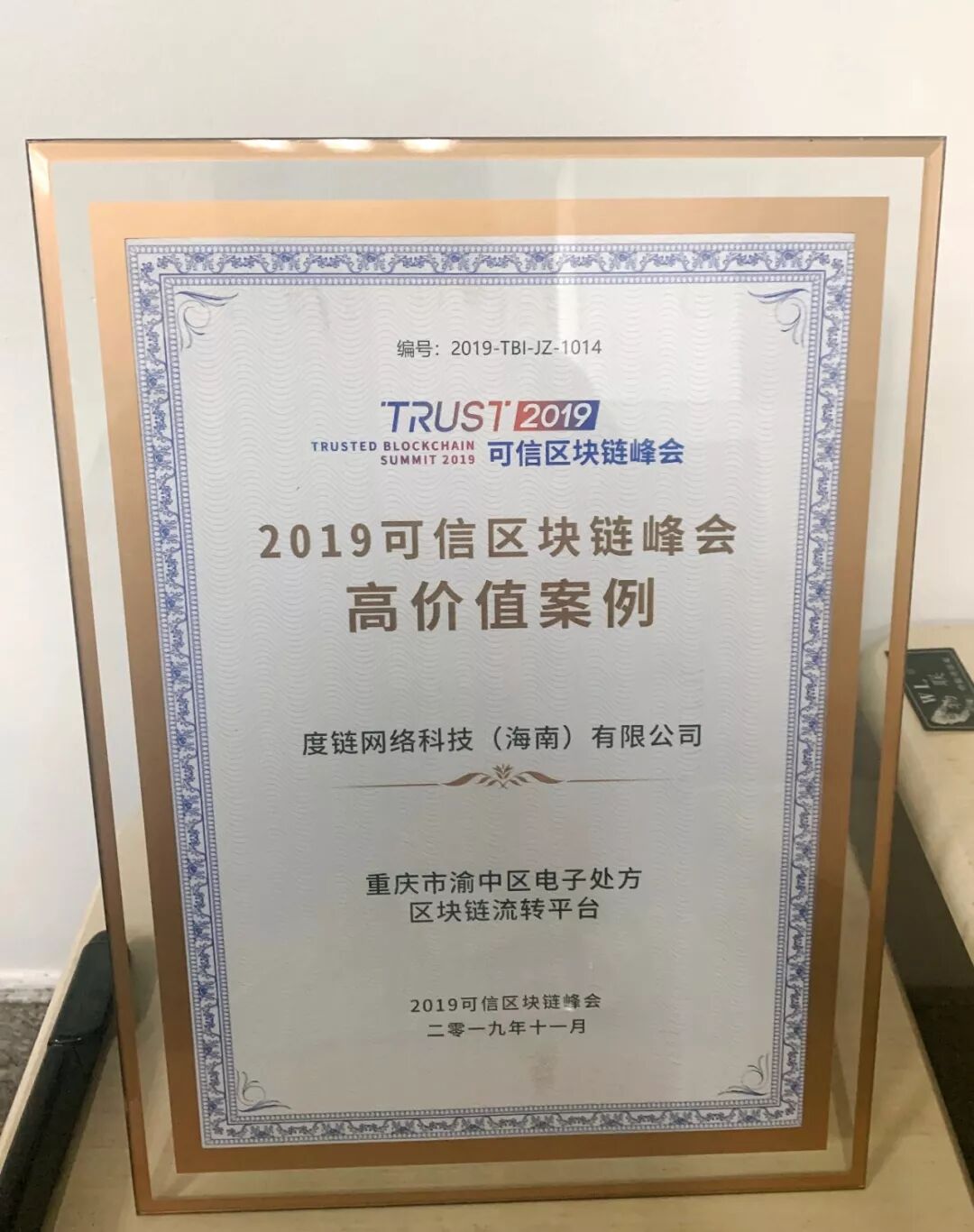 近期,“区块链高价值案例”在中国信息通信研究院、中国通信标准化协会、可信区块链推进计划等联合主办的2019可信区块链峰会上发布。